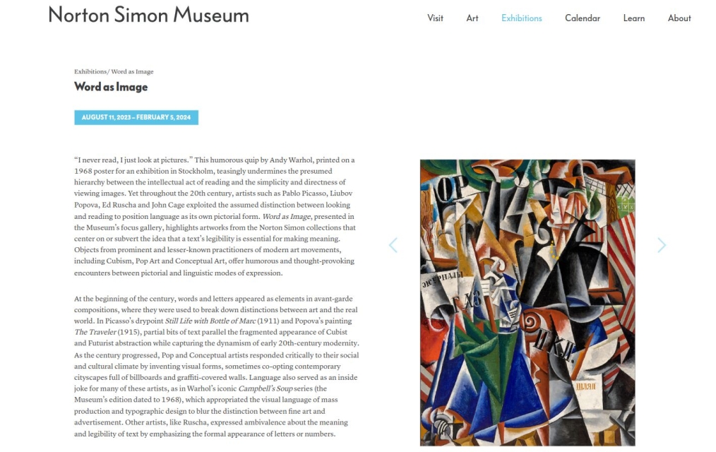 An exhibition held in the exhibition gallery on the main floor of the Norton Simon Museum in Pasadena, CA. I copyedited and proofed all interpretive materials. I worked closely with the curator, Alexandra Kaczenski, now at LACMA, on balancing concision with comprehension.