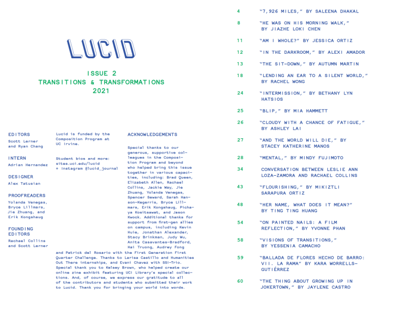 LUCID is a journal of first-generation student writing, headquartered at the University of California, Irvine. I worked with one of the founding editors, Scott Lerner, on the second issue, overseeing the whole scope of the project, from soliciting and reading submissions, working with one of the student's writer to develop her story (pictured here), to securing the designer Alex Tatusian.